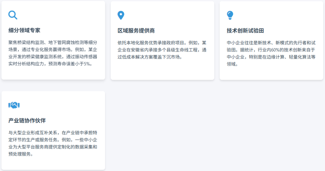 2025 年城市生命線行業(yè)呈 “政策驅(qū)動(dòng)、技術(shù)密集、頭部集中” 特征,中小企業(yè)需避開與頭部企業(yè)正面競(jìng)爭(zhēng),通過垂直深耕細(xì)分場(chǎng)景、組建合作聯(lián)盟、創(chuàng)新商業(yè)模式突破發(fā)展瓶頸。